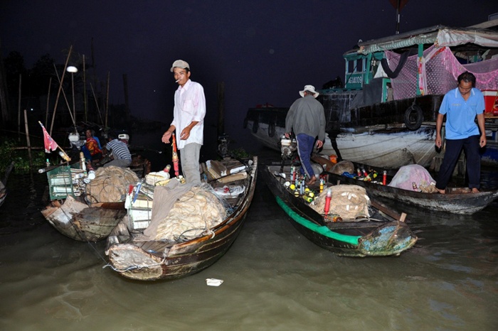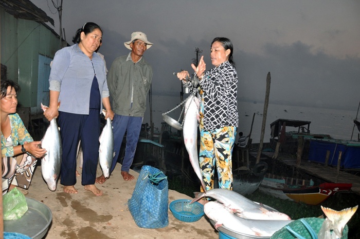 Thương lái chờ mua sản phẩm ngay từ trên thuyền...