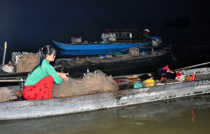 Dễ nhận thấy những bóng dáng phụ nữ cũng dong xuồng đi thả lưới không thua đàn ông.