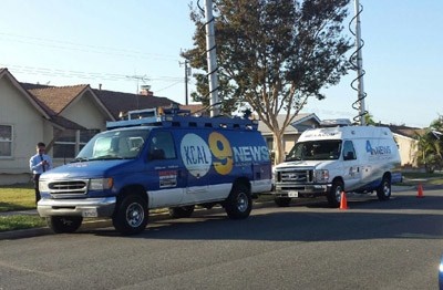 | Nhiều đài truyền hình đến nhà nghi can đưa tin. |