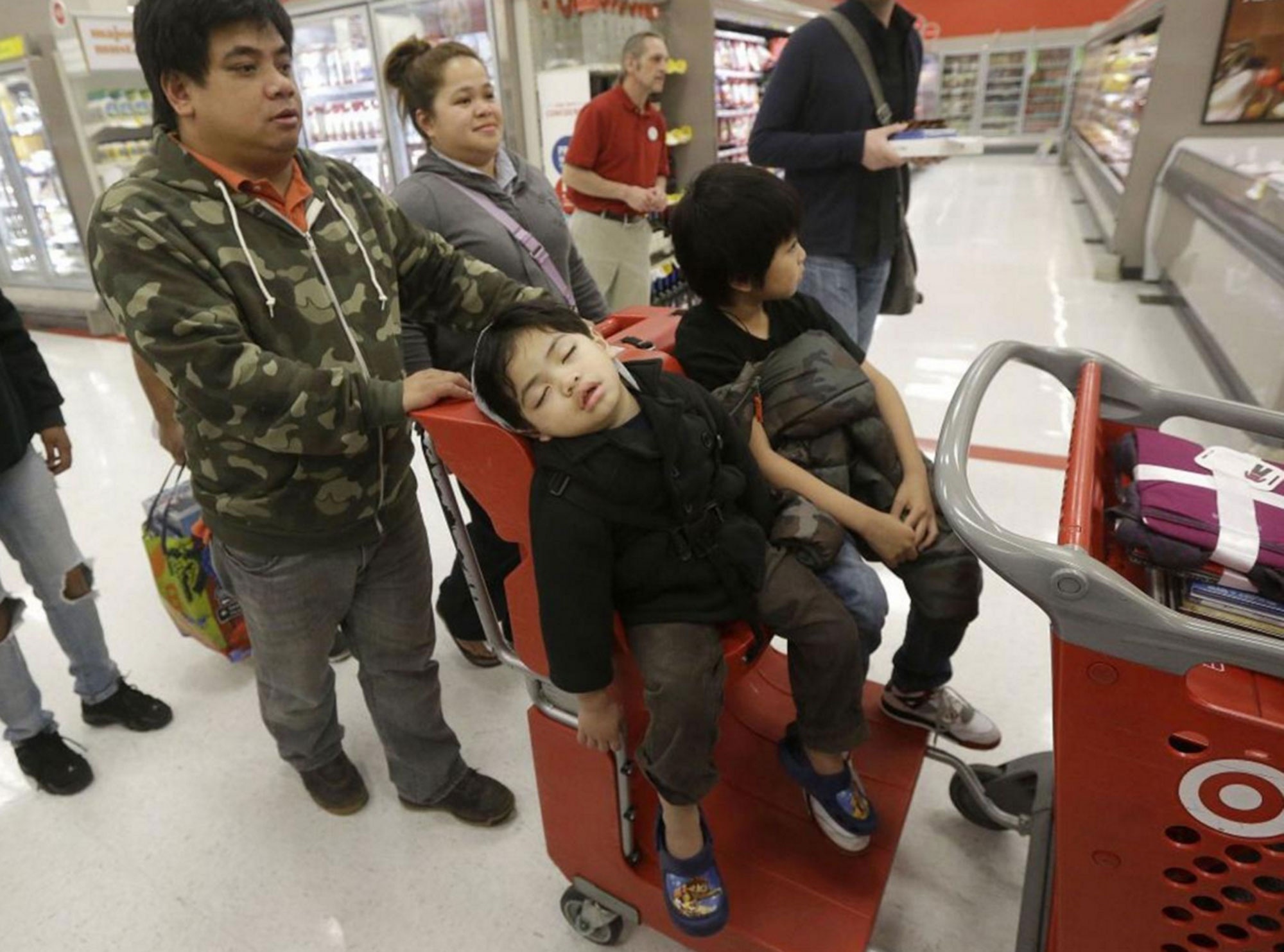 | Trẻ em mệt mỏi ngủ gật khi cha mẹ xếp hàng mua đồ tại Target, California. Ảnh: AP. |