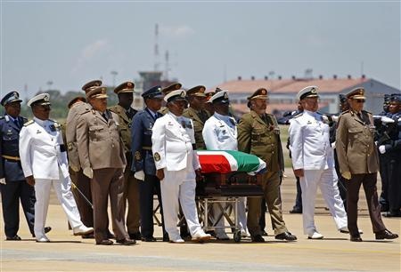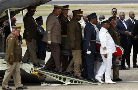 | Sau buổi lễ tiễn biệt của đảng cầm quyền, các sĩ quan đưa thi hài của Mandela lên một máy bay vận tải quân sự Hercules C-130. Ảnh: Reuters |