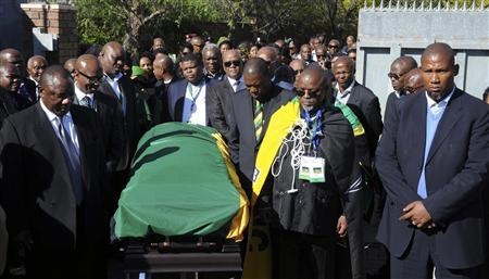| Thành viên của đảng Đại hội Dân tộc Phi rước thi hài Mandela về nhà của ông tại làng Qunu, tỉnh Đông Cape hôm 14/12. Ảnh: Reuters |