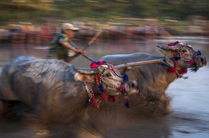 Các tay đua sử dụng những gậy dài để điều khiển trâu của họ vượt qua những ruộng lúa ngập bùn và về đích nhanh nhất.