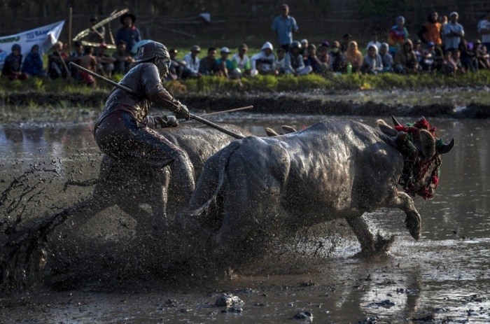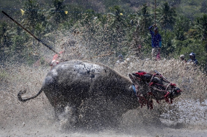 Người ngã nhào trong lễ hội đua trâu ở Indonesia