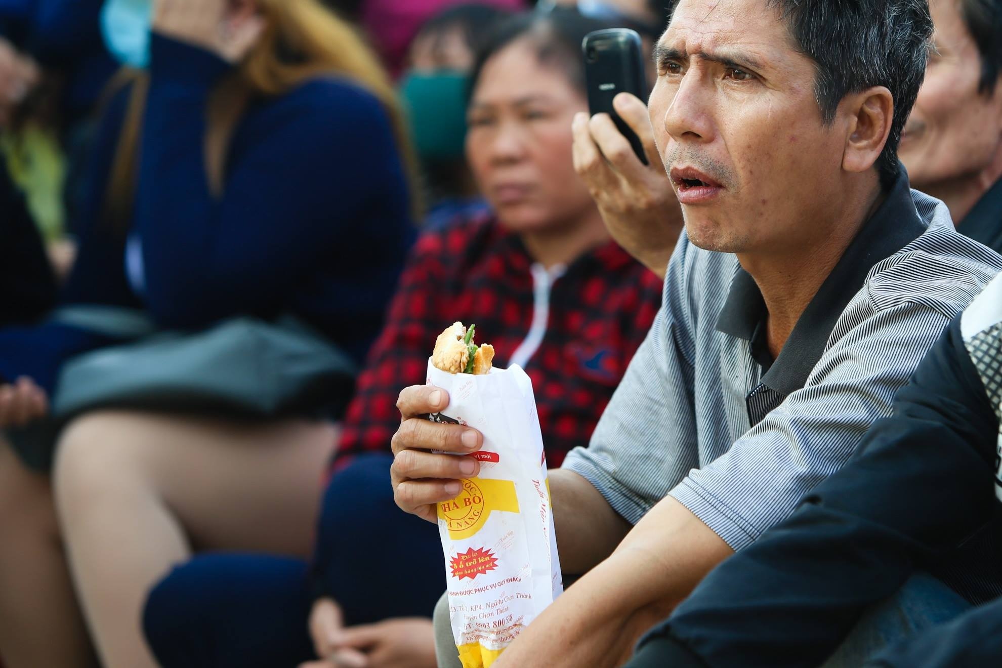 Một người dân ngồi xem phiên xử lót dạ bằng chiếc bánh mỳ.
