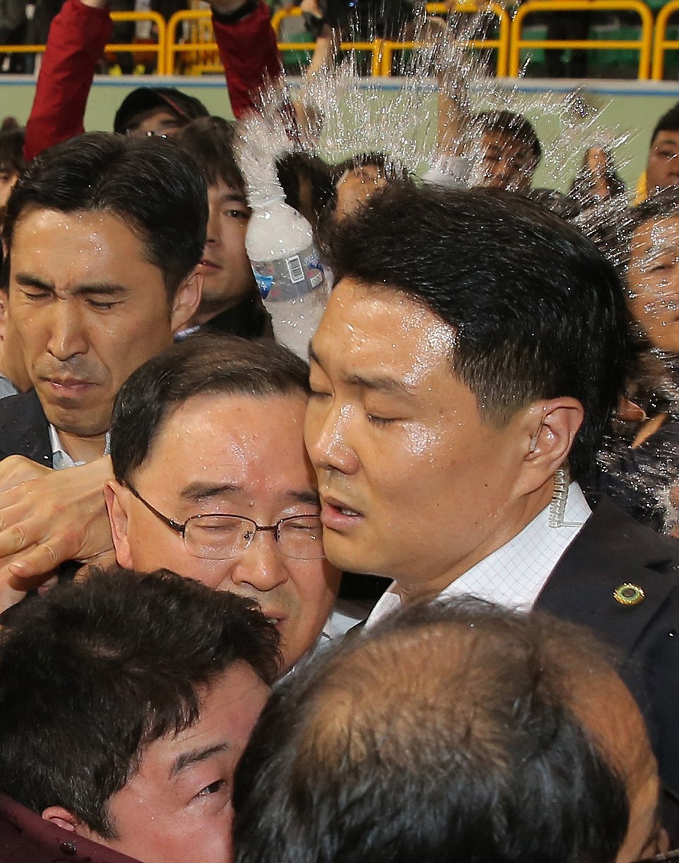 | Một vệ sĩ (bên phải) của Thủ tướng Hàn Quốc đỡ chai nước từ phía một người trong đám đông. Ảnh: AP. |