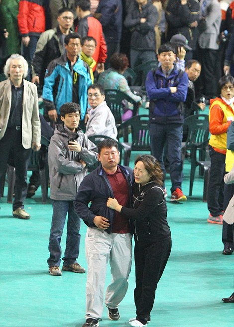 | Người nhà hành khách tập trung tại phòng tập thể hình ở Jindo. 11 phụ huynh thuê thuyền để tìm con. Mỗi gia đình góp 60 USD để thuê thuyền, International Business Times đưa tin. Ảnh: Tân Hoa Xã. |