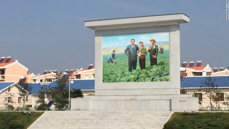 Kim Myong Yon trở thành người quản lý hợp tác xã nông nghiệp Jang Chon từ 47 năm trước. Bà đảm trách công việc này năm 23 tuổi, sau khi thẳng thắn nói chuyện về tình trạng làm việc kém hiệu quả của nông trang với nhà lãnh đạo Kim Nhật Thành, người sáng lập đất nước Triều Tiên. Hình ảnh bà và nhà lãnh đạo Kim Nhật Thành trên bức tranh màu ngay bên ngoài nông trang Jang Chon. |