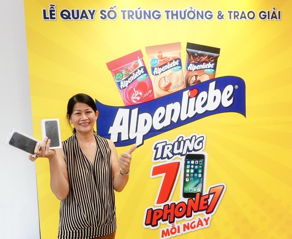Đi ngược lại với suy nghĩ của nhiều người, cô Tống Thị Kim Hồng (quận 8, TP.HCM) - người nội trợ trung niên, dùng điện thoại bình thường nhắn tin mã dự thưởng đã trúng đến 3 chiếc iPhone 7 trong 3 ngày 15/10, 16/10 và 31/10. Phần thưởng này thuộc chương trình khuyến mãi (CTKM) “Trúng 7 iPhone 7 mỗi ngày” của Alpenliebe.