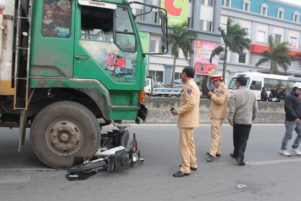 Tại hiện trường, chiếc xe máy dính dưới bánh trước của xe tải, bị hư hỏng nặng. Vụ tai nạn xảy ra tại ngã tư giao nhau, lượng người lưu thông đông dẫn đến tình trạng ách tắc kéo dài.