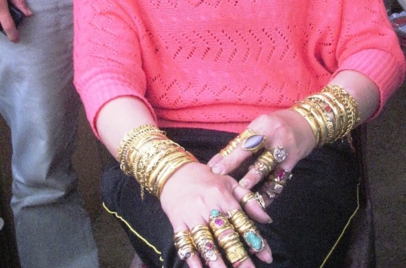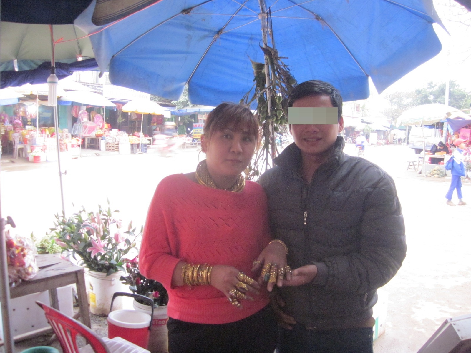 Khi được hỏi chuyện liên quan đến số trang sức trên, chị Tình e dè: “Tài sản của tôi có thì tôi đeo”. Số trang sức được người phụ nữ này đeo kín từ hai cánh tay đến tất cả các ngón tay, cổ và tai.