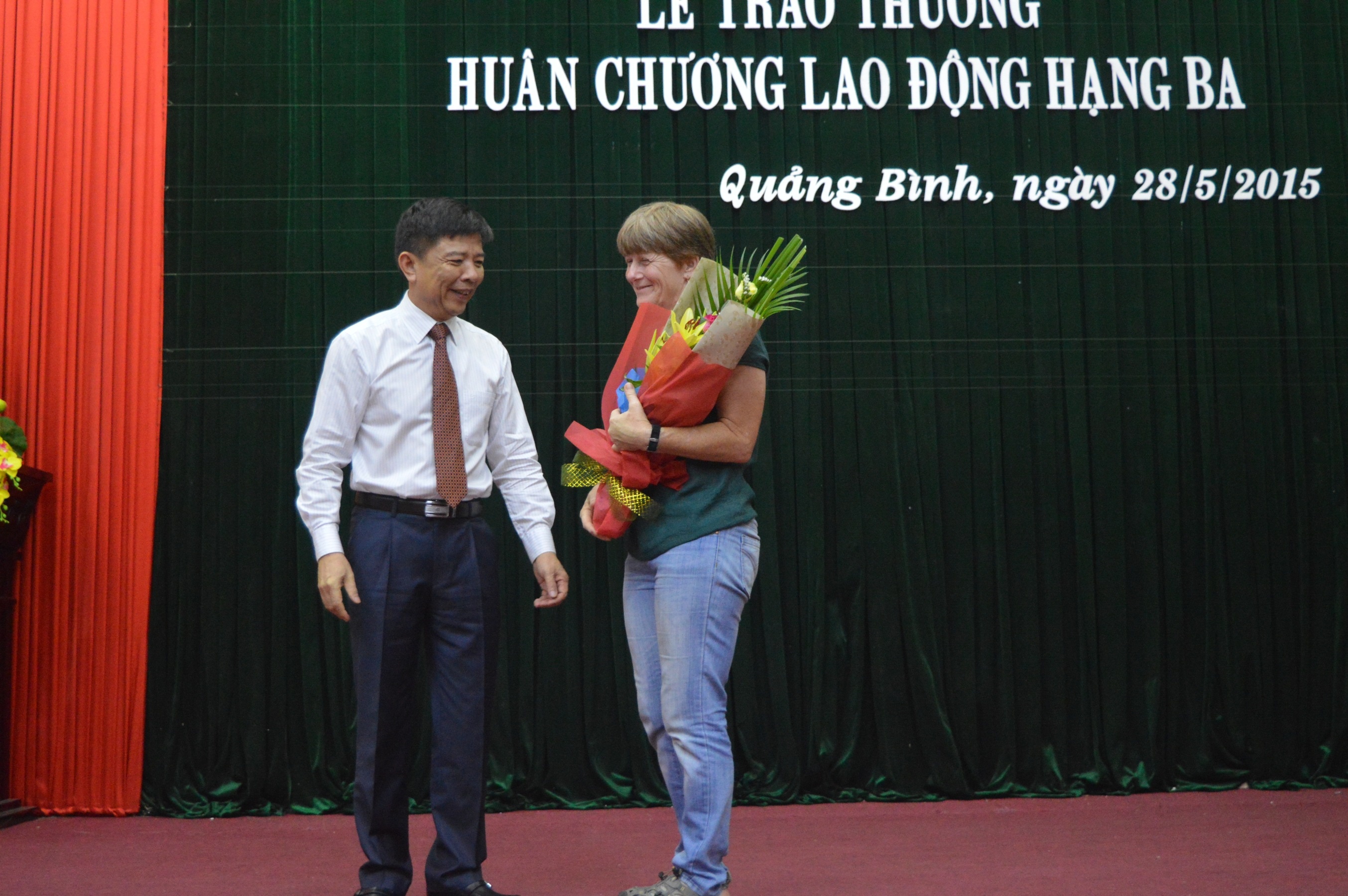 | Chủ tịch UBND tỉnh Quảng Bình tặng hoa cho Deb Limbert hôm 28/5. Ảnh: Văn Được. |