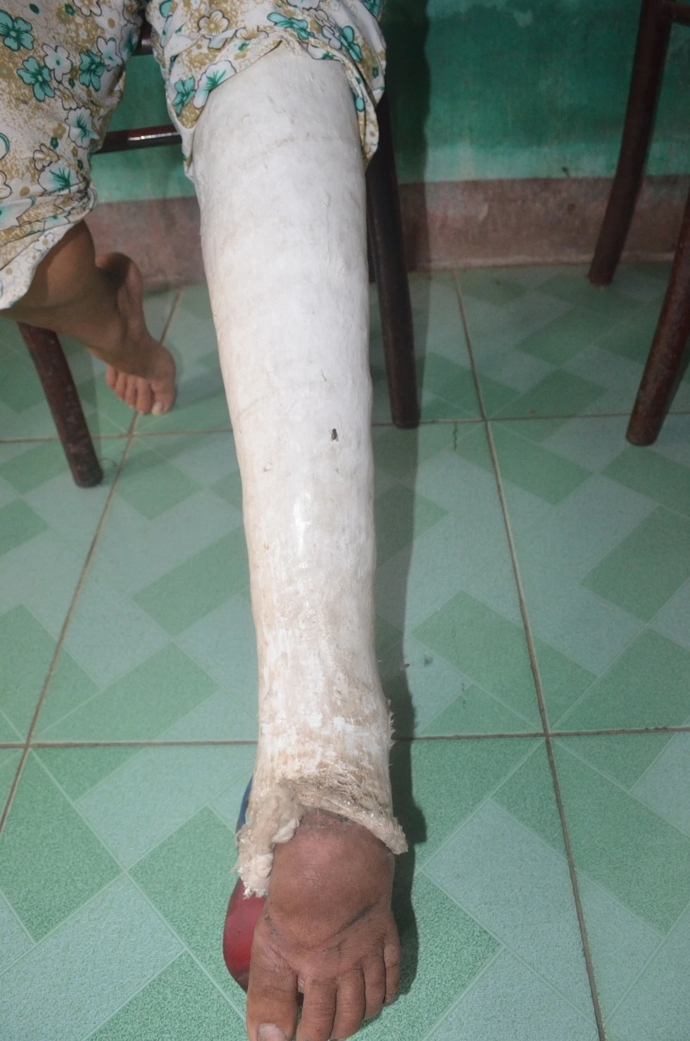 4 năm trước, đang đi làm bà Hoa chẳng may trượt chân té ngã gãy xương đùi và rạn nứt đến gót bàn chân. Các bác sĩ bó bột cho bà từ bẹn đùi cho đến mắt cá. Thông thường, sau một tháng, bệnh nhân sẽ đến bệnh viện cắt bột nhưng bà Hoa vì lam lũ nên... quên. Chồng bị tai biến nằm trên giường không ai chăm sóc, con trai còn nhỏ lại đang tuổi ăn học nên tôi phải làm lụng để mua thuốc men, lo bữa ăn cho gia đình. Tất cả khiến tôi như quay cuồng nên quên đi cắt băng bột", bà Hoa kể. |