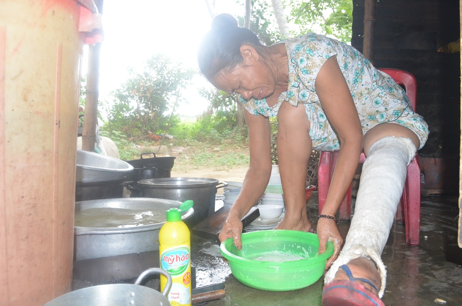 Bà Hoa tâm sự, do chân bị băng bột nên nhiều lúc đi đứng bị té ngã, tối về đau nhức suốt đêm không ngủ được. Nhiều lúc chán nản, định bỏ cuộc nhưng nghĩ tới chồng, con nên phải cố gắng. |