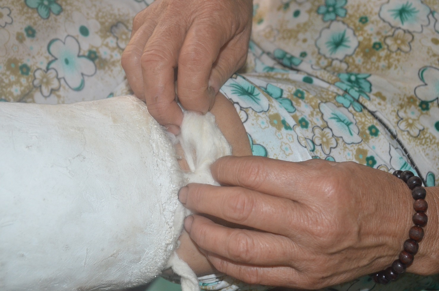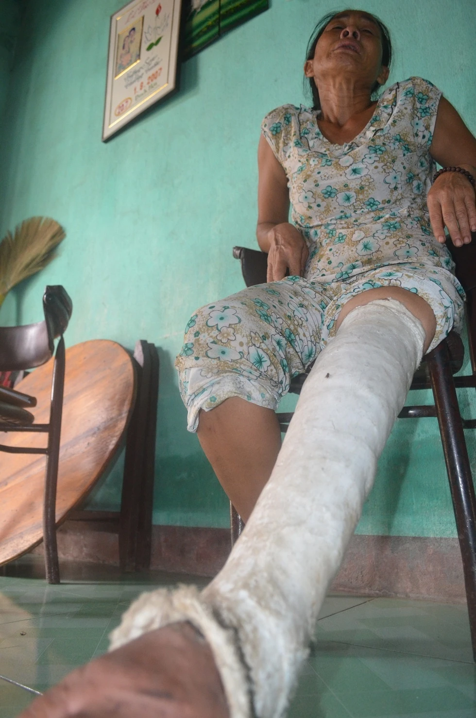 | Vì chân bị bó bột thẳng đơ nên việc đi lại, ngồi, làm việc của bà rất khó khăn và đau đớn. |