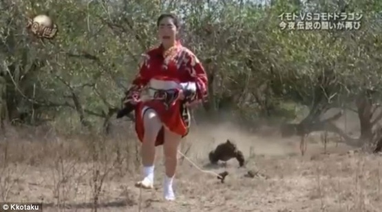 | Ayako mặc bộ kimono truyền thống, buộc một sợi dây thừng vào bụng, còn đầu dây buộc một miếng thịt sống. Sau đó, cô cố tình thu hút sự chú ý của một con rồng Komodo. |