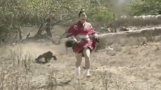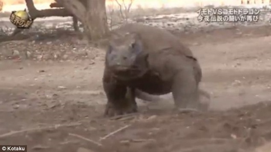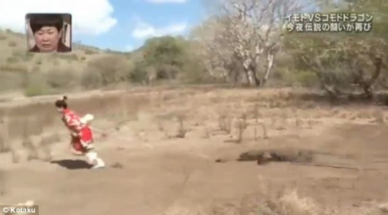 | Ngay khi con vật hung dữ lao tới chỗ miếng thịt, Ayako liền bỏ chạy. Con Komodo tăng tốc để cố gắng đuổi theo miếng mồi còn Ayako chạy thục mạng. Cô chạy tới chỗ nhóm người đang chụp ảnh. Họ liền lấy gậy xua đuổi con vật hung dữ đang đói bụng đi chỗ khác. |
