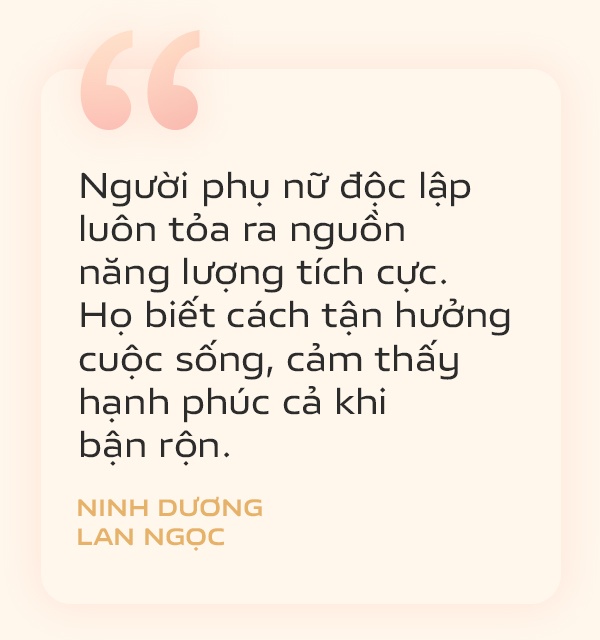Diễn viên Ninh Dương Lan Ngọc cho biết cô luôn bản thân luôn bị thu hút trước những người phụ nữ độc lập. Họ tỏa ra nguồn năng lượng tích cực, sự tự tin, chủ động trong cuộc sống và tài chính.
