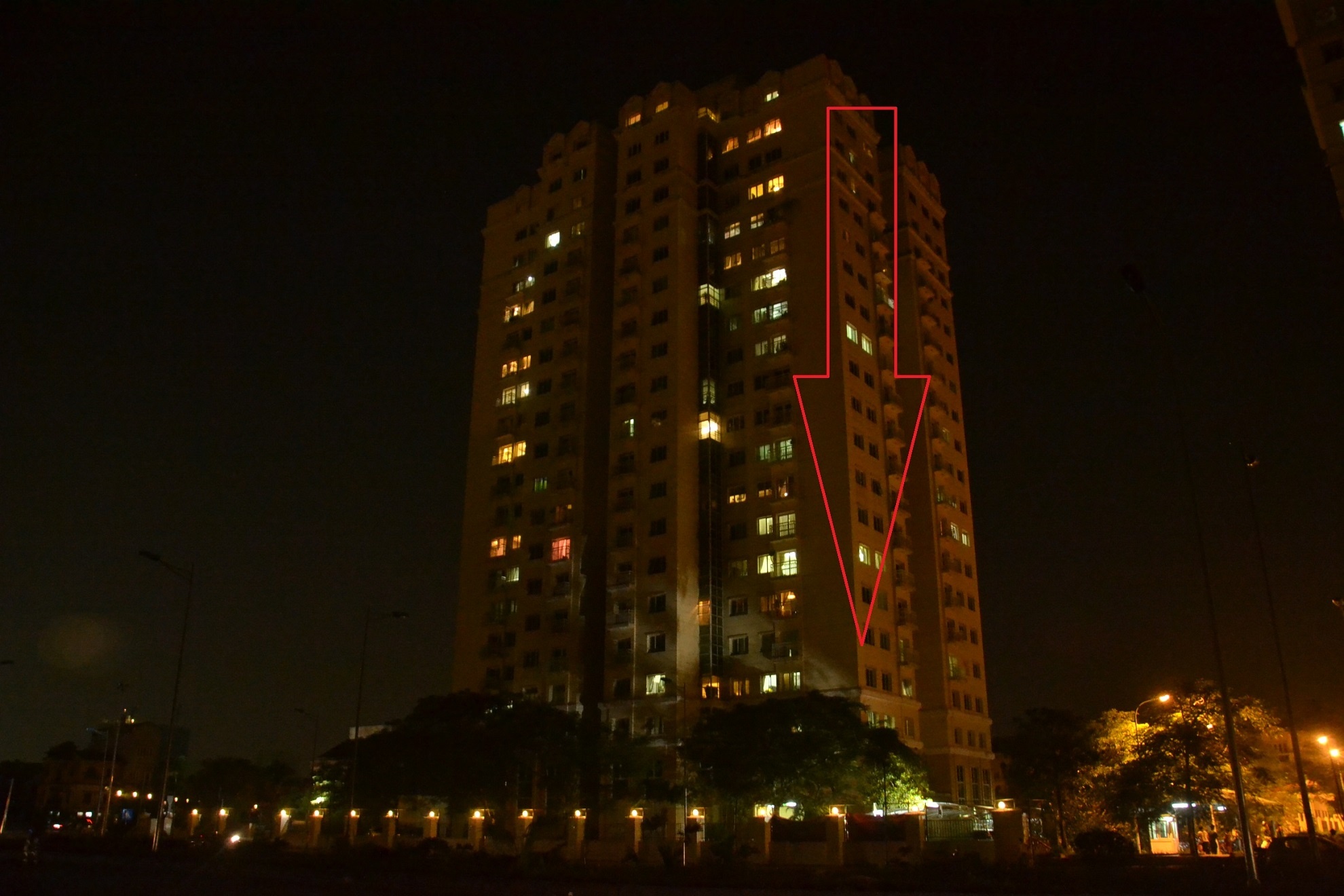 | Vị trí người phụ nữ bị rơi từ tầng 19 nhìn từ bên ngoài khu chung cư sang trọng. Ảnh: Hoàn Nguyễn. |