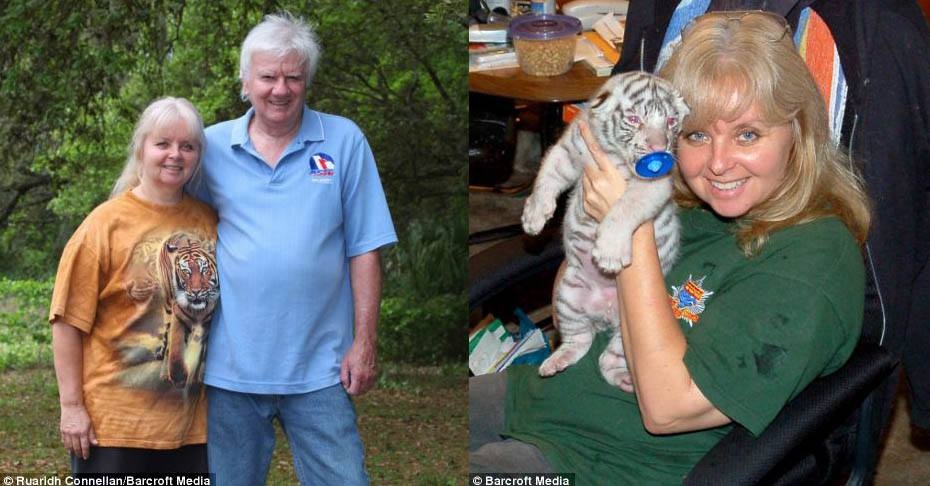 | Bà Janice Haley, 57 tuổi, nuôi một cặp hổ làm thú cưng tại nhà riêng của bà ở ngoại ô thành phố Orlando, bang Florida, Mỹ. Bà Janice rất yêu cặp hổ và thường xuyên âu yếm, vuốt ve chúng. |