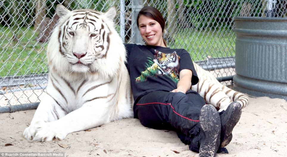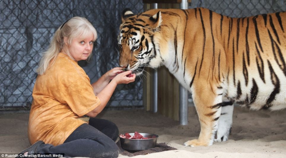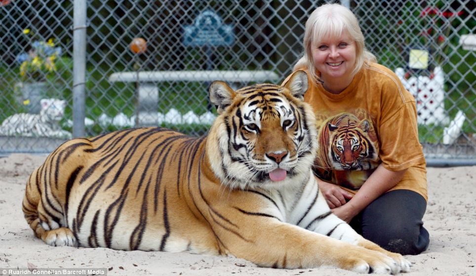 http://www.dailymail.co.uk/news/article-2639040/Woman-keeps-two-Bengal-tigers-garden-treats-like-normal-pets-hand-feeding-stroking-them.html