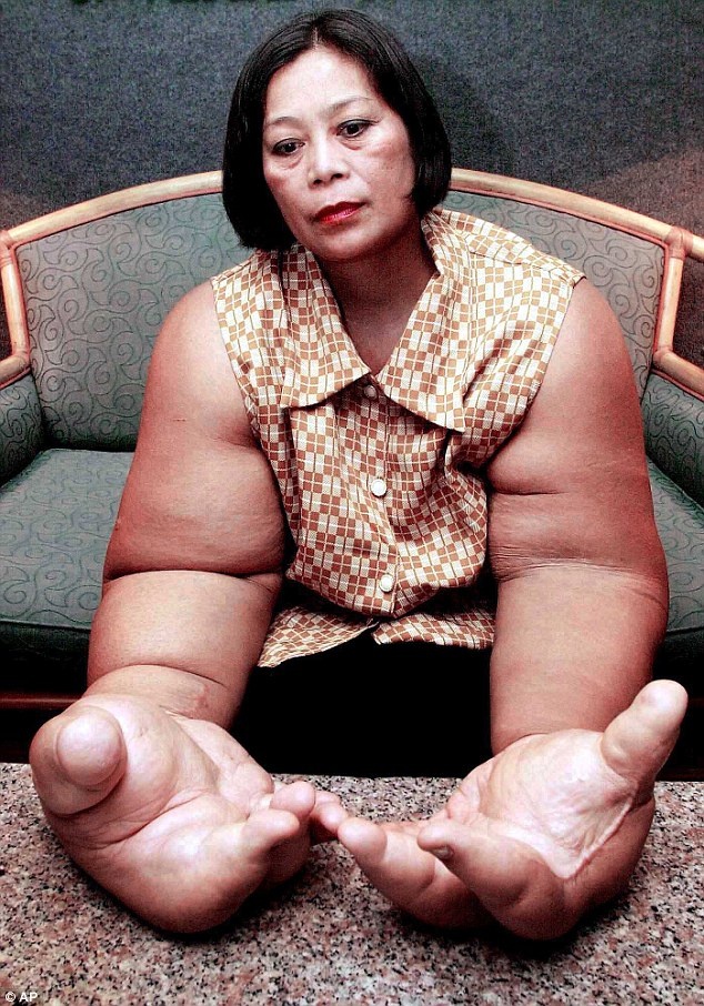 Bà Duangjay Samaksamam, 59 tuổi người Thái Lan sở hữu đôi tay lớn nhất thế giới vì mắc chứng bệnh lạ khiến mỡ tập trung vào hai tay. Nó khiến đôi tay của bà liên tục phát triển và biến dạng. Ảnh: AP |