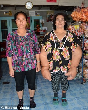 Để duy trì cuộc sống, bà Samaksamam đang bán một sạp hàng nhỏ ở quê nhà. Công việc không đòi hỏi bà di chuyển quá nhiều nên có thể hạn chế phần nào tác hại của đôi tay khổng lồ. Ảnh: Barcroft Media |