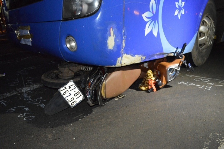 | Chiếc xe máy nằm dưới gầm xe khách. Ảnh: M. Q. |