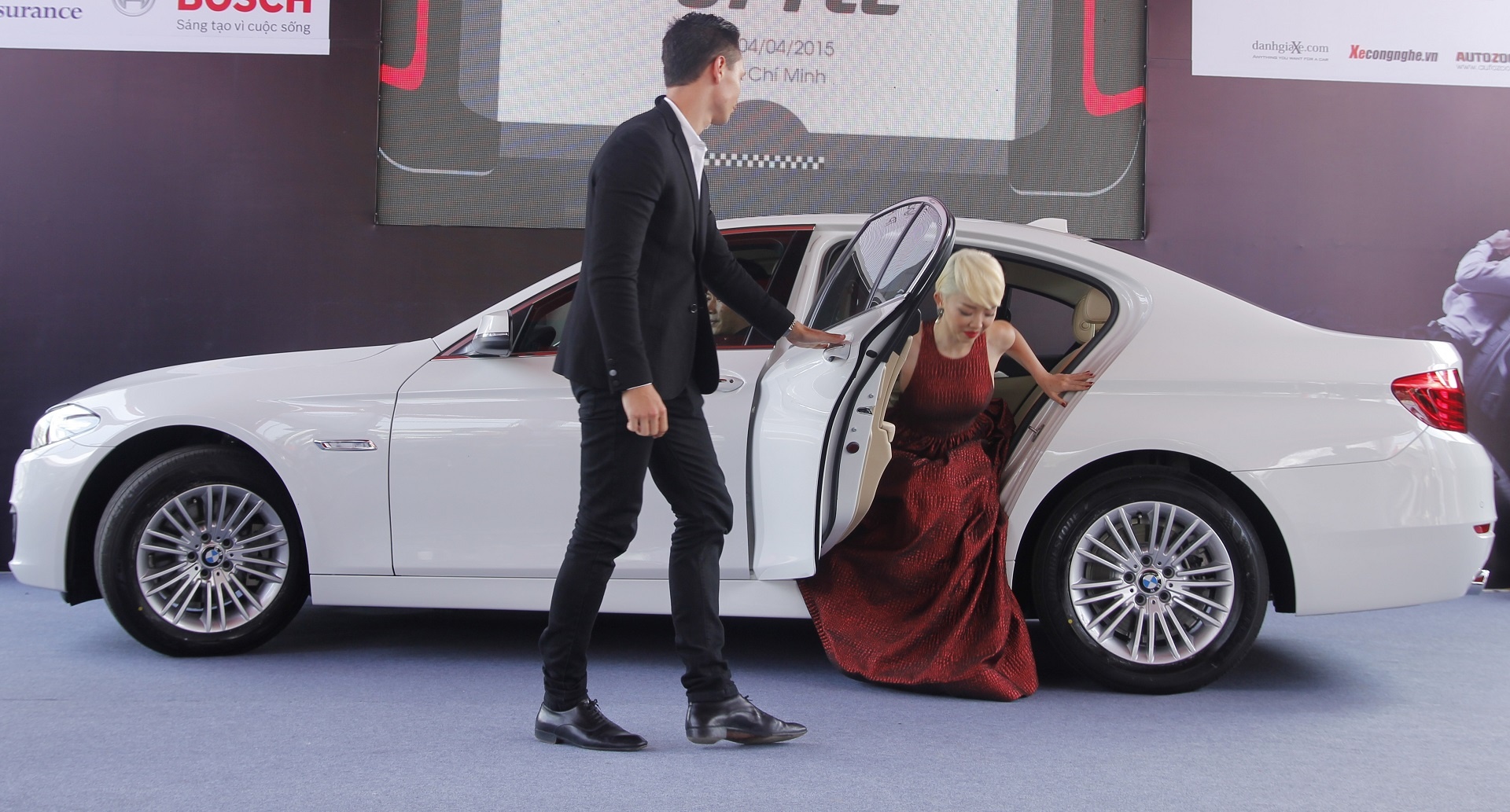 | Ca sĩ Tóc Tiên và diễn Viên Kim Lý hướng dẫn cách lên xuống xe sang trọng. Ảnh: Minh Anh. |