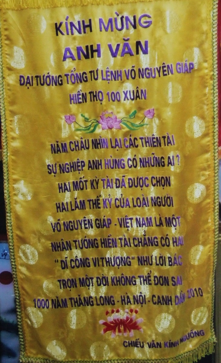| Bức trướng mừng thọ Đại tướng 100 tuổi của Hội đồng hương Quảng Bình tại TP.HCM. |