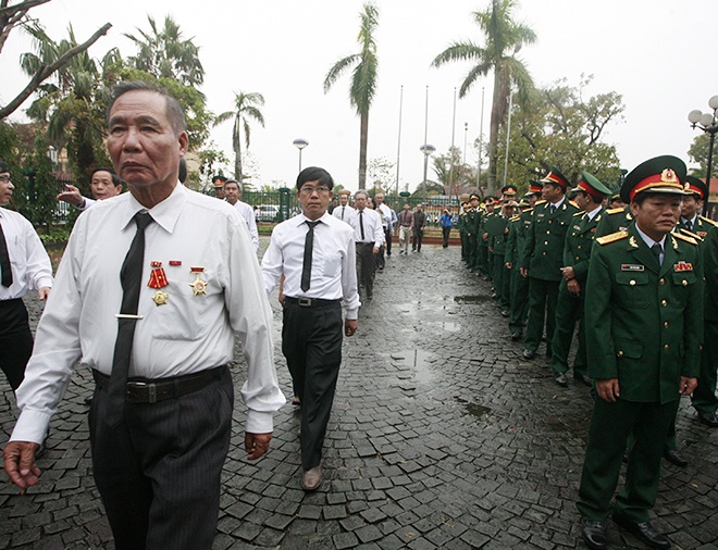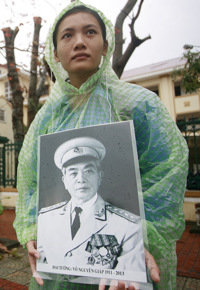 | 8h, cơn mưa mỗi lúc một to, hàng trăm người vẫn đứng nghiêm trang chờ được viếng Đại tướng. |