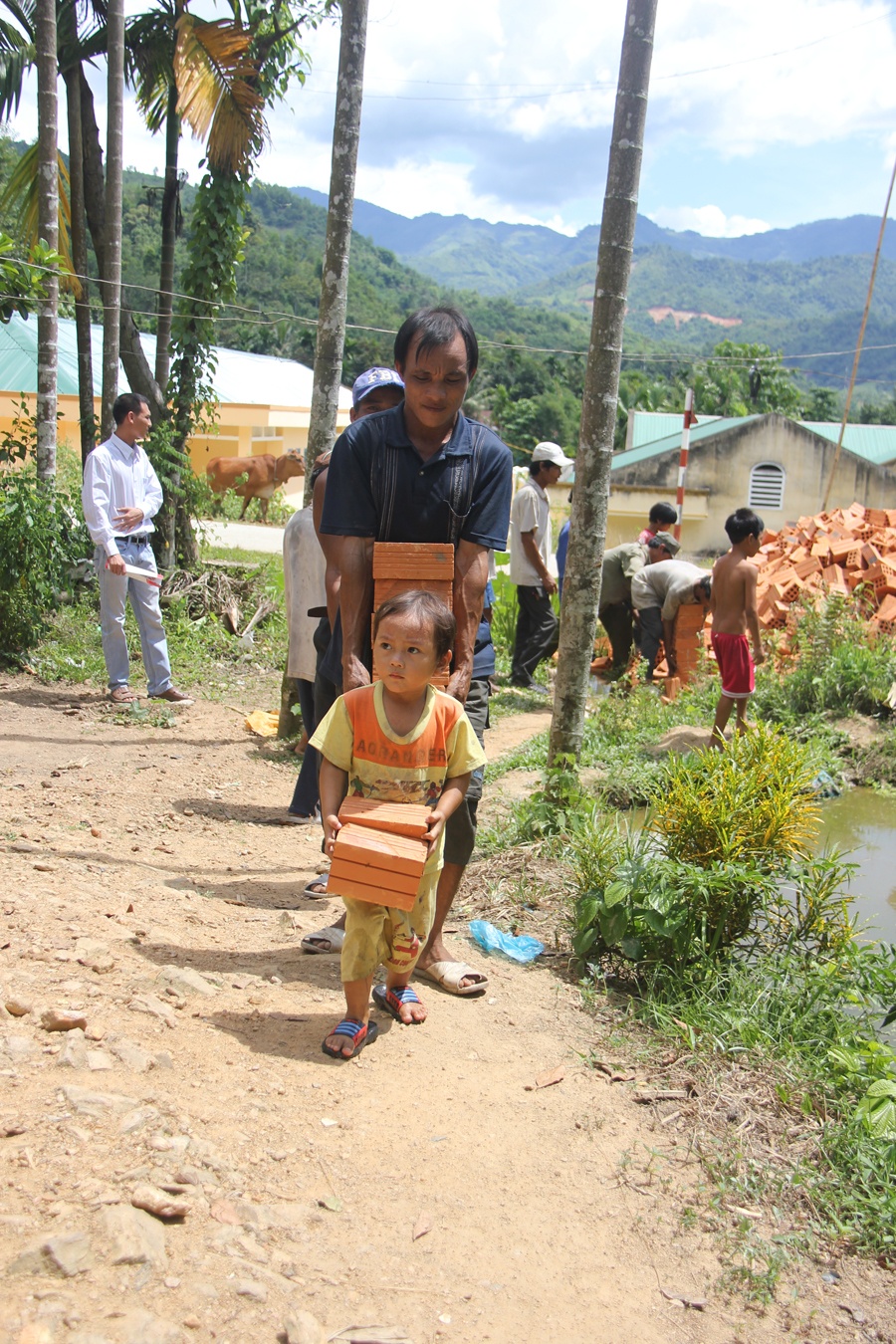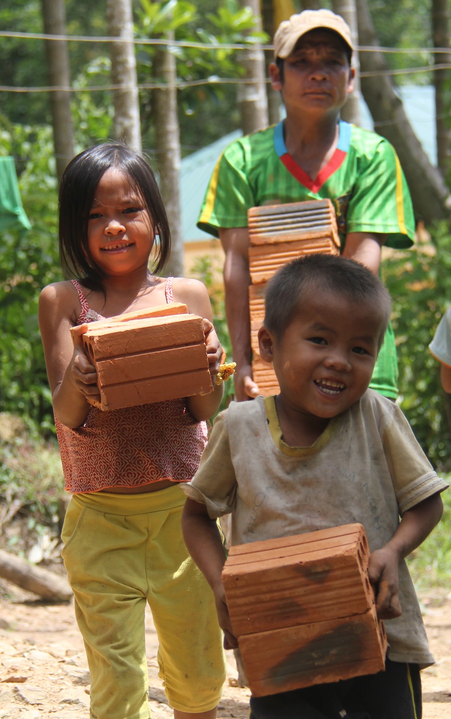 Nhiều trẻ em cũng tham gia chuyển gạch giúp cha con "người rừng". |