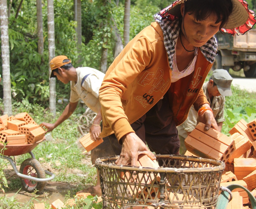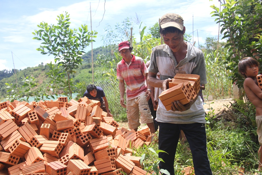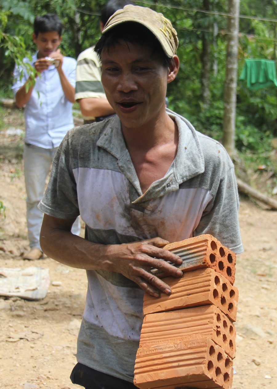 | Anh Lang hào hứng bưng bê gạch để xây nhà cho cha con anh. |