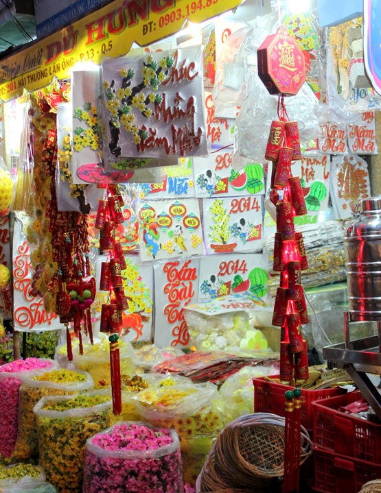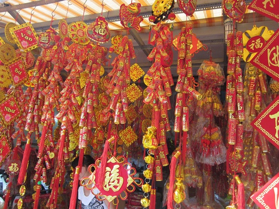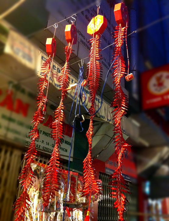 Những dây pháo trang trí xen lẫn với pháo điện tử đỏ rực cả con đường Hải Thượng Lãn Ông, quận 5 TP.HCM.