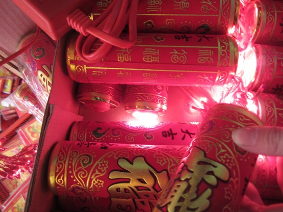 | Còn đây là một loại pháo điện tử được kết từ những chiếc đèn nhấp nháy, kích thước và hình dáng giống với tràng pháo cổ truyền, có giá 350.000 đồng/dây. |
