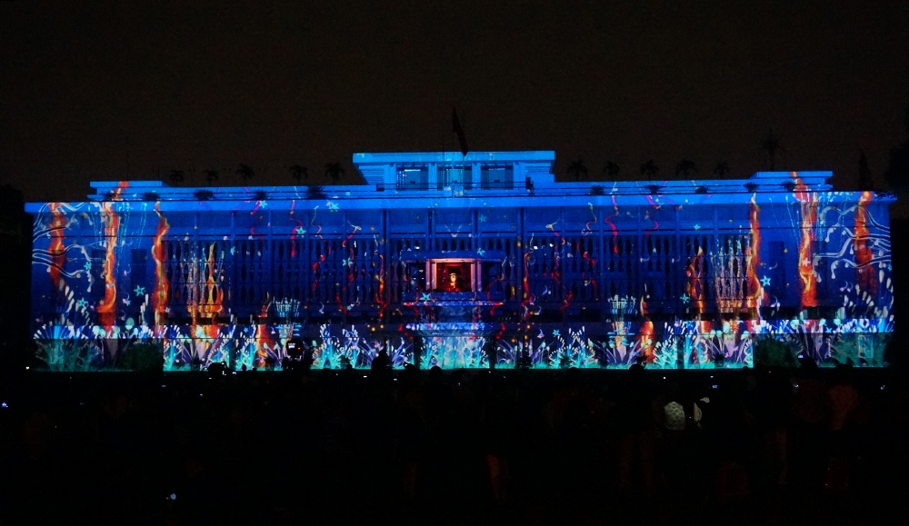 | Đây là một màn trình diễn đặc biệt, sử dụng những máy chiếu công suất lớn và các thủ pháp ánh sáng khiến toàn bộ Dinh Thống Nhất phát sáng và liên tục đổi màu, họa tiết theo điệu nhạc. |