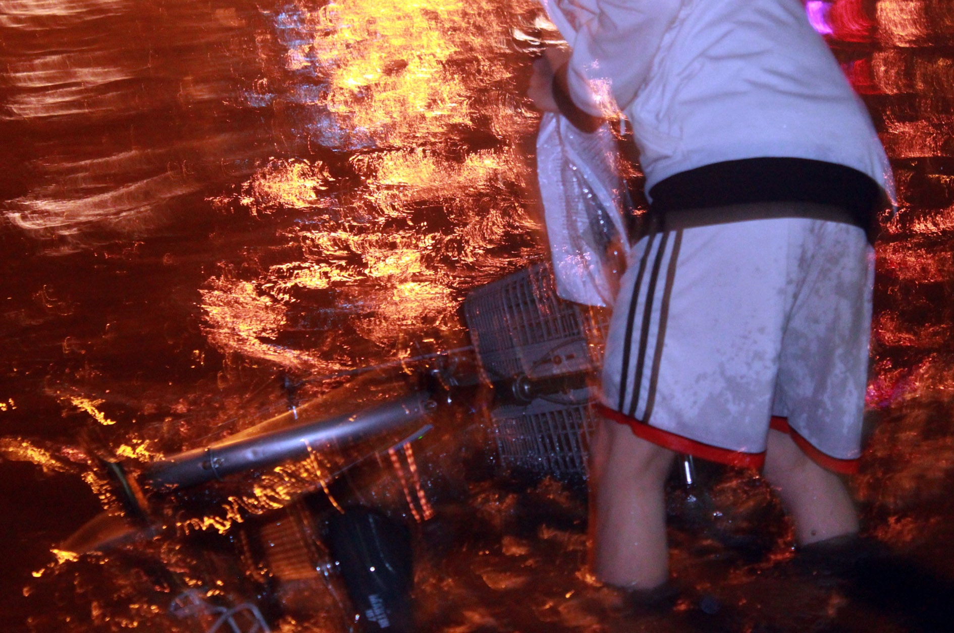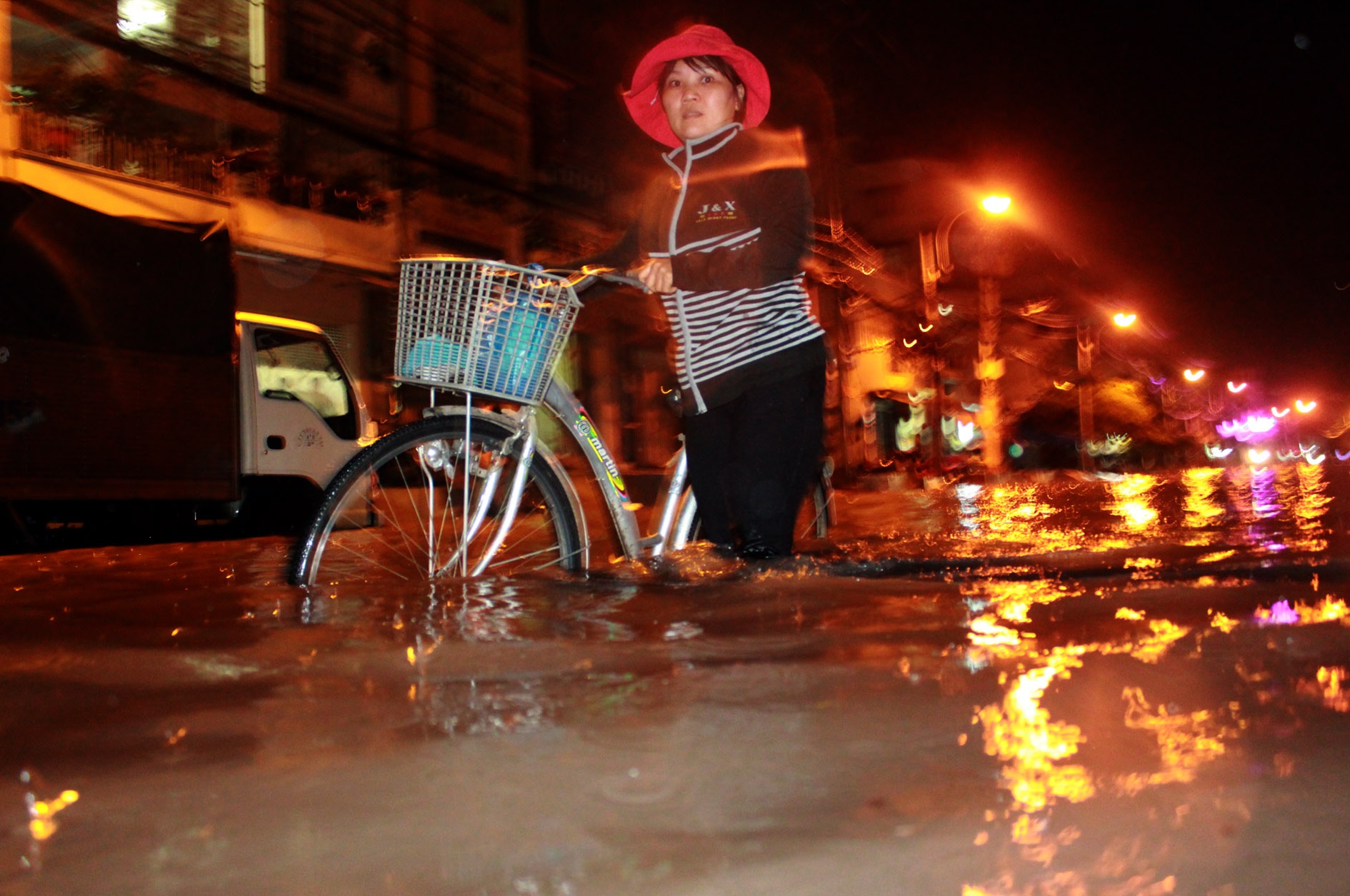 | Chị Nga (ngụ quận Tân Phú), đẩy xe hàng rong về nhà vào đêm tối vượt qua biển nước trên đường Tân Hóa. |