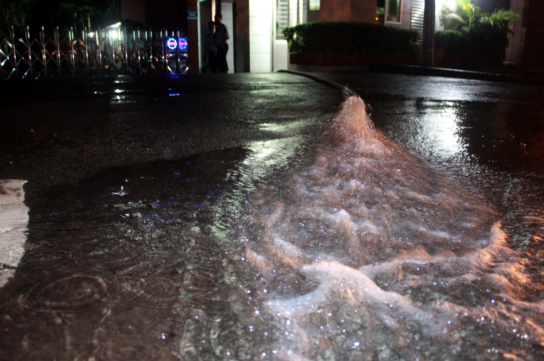 | Công ty trên đường Hồng Bàng, quận 6 bị nước ngập sâu, bảo vệ phải dùng máy bơm công suất lớn bơm nước ra. |