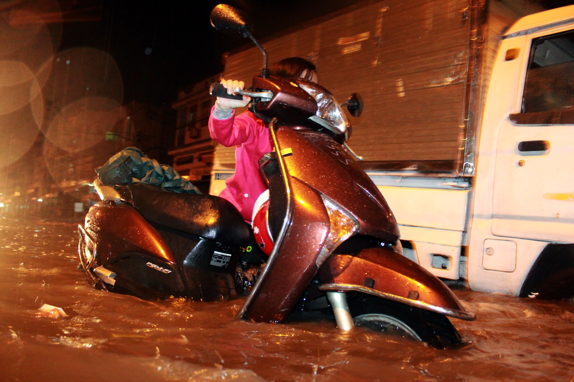 | Không ít người liều phóng qua đường ngập nhưng nước quá sâu khiến xe chết máy giữa đường. |