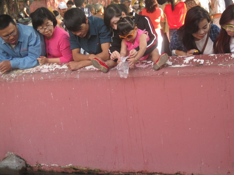 | ... Bé gái cũng bắt chước phóng sinh cá xuống hồ. |