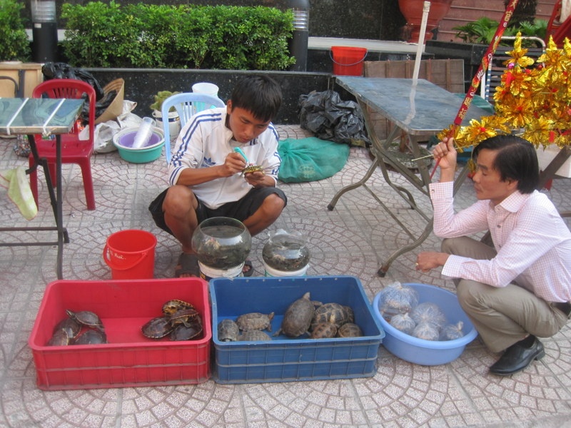 | Một người đàn ông mua rùa để phóng sinh. |