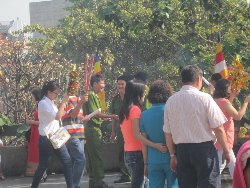 Lực lượng công an phường 7, quận 3 cũng có mặt tại chùa Vĩnh Nghiêm để bảo vệ trật tự cho người dân đi lễ.