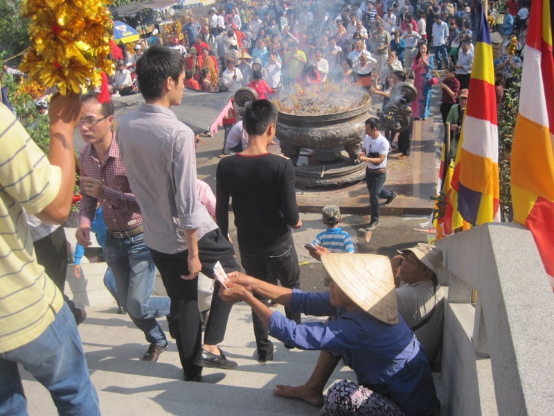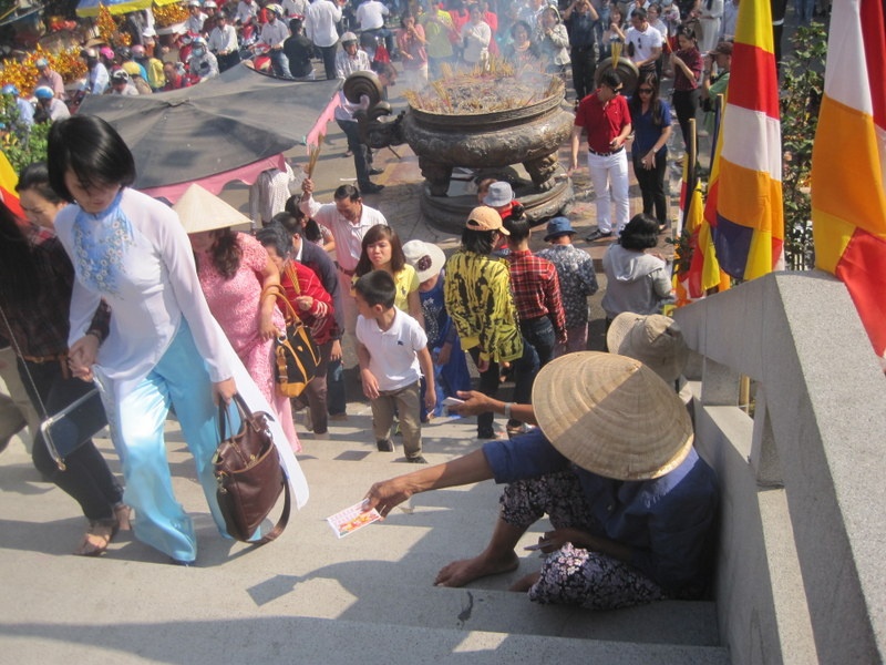 | Những người bán vé số níu chân người đi chùa mời mua. |