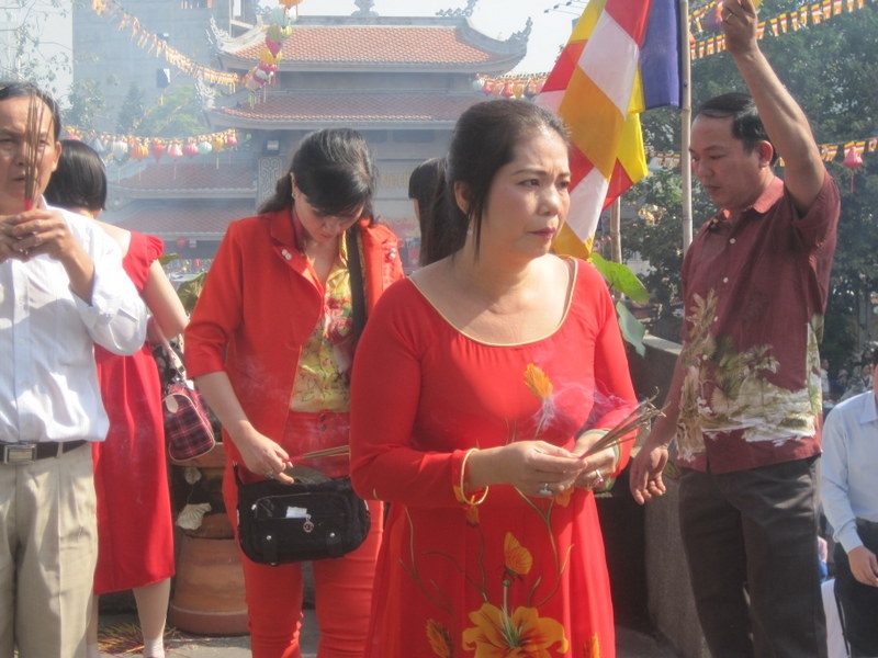 Niều thiếu nữ, quý bà diện áo dài đỏ đi thắp hương lễ Phật.