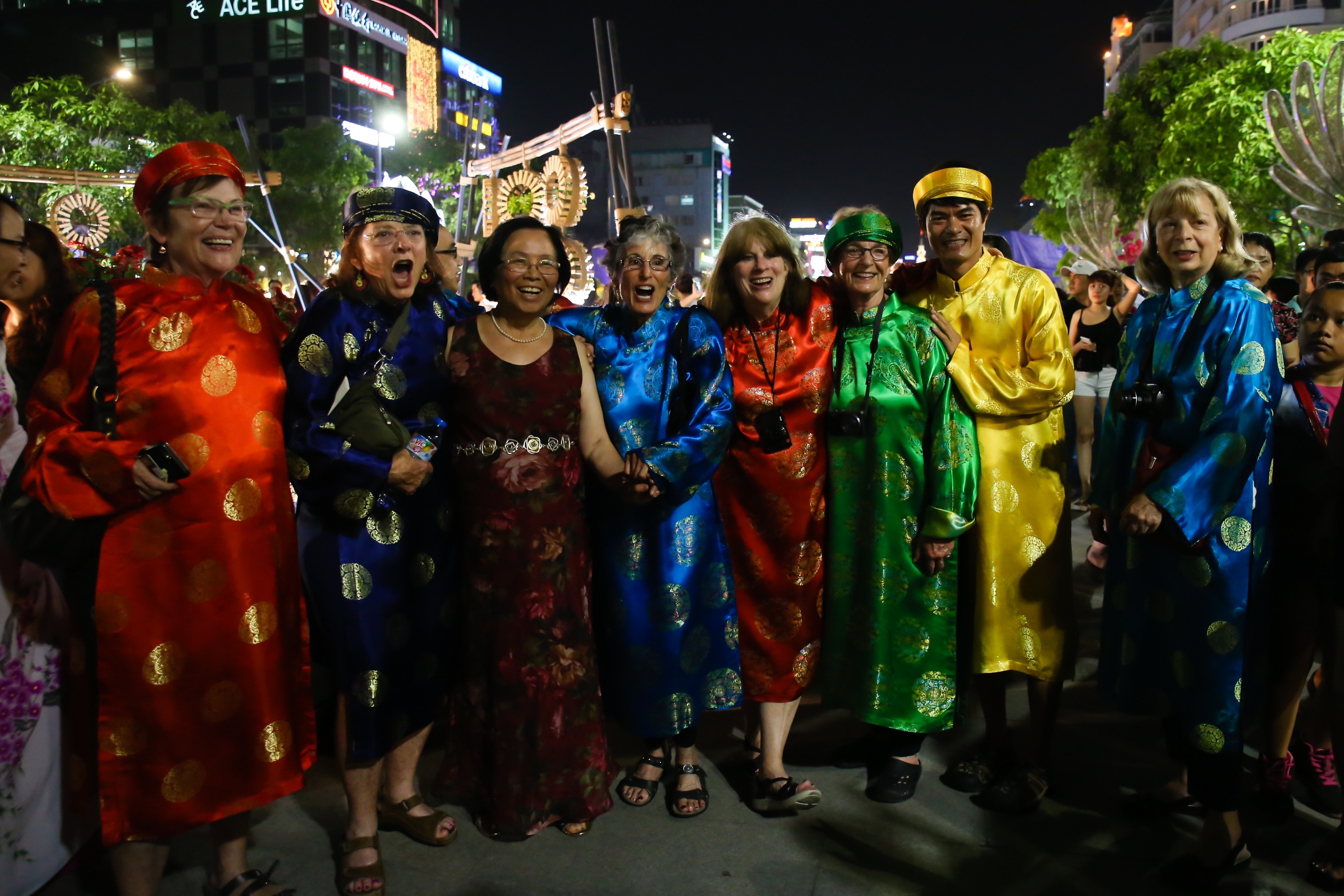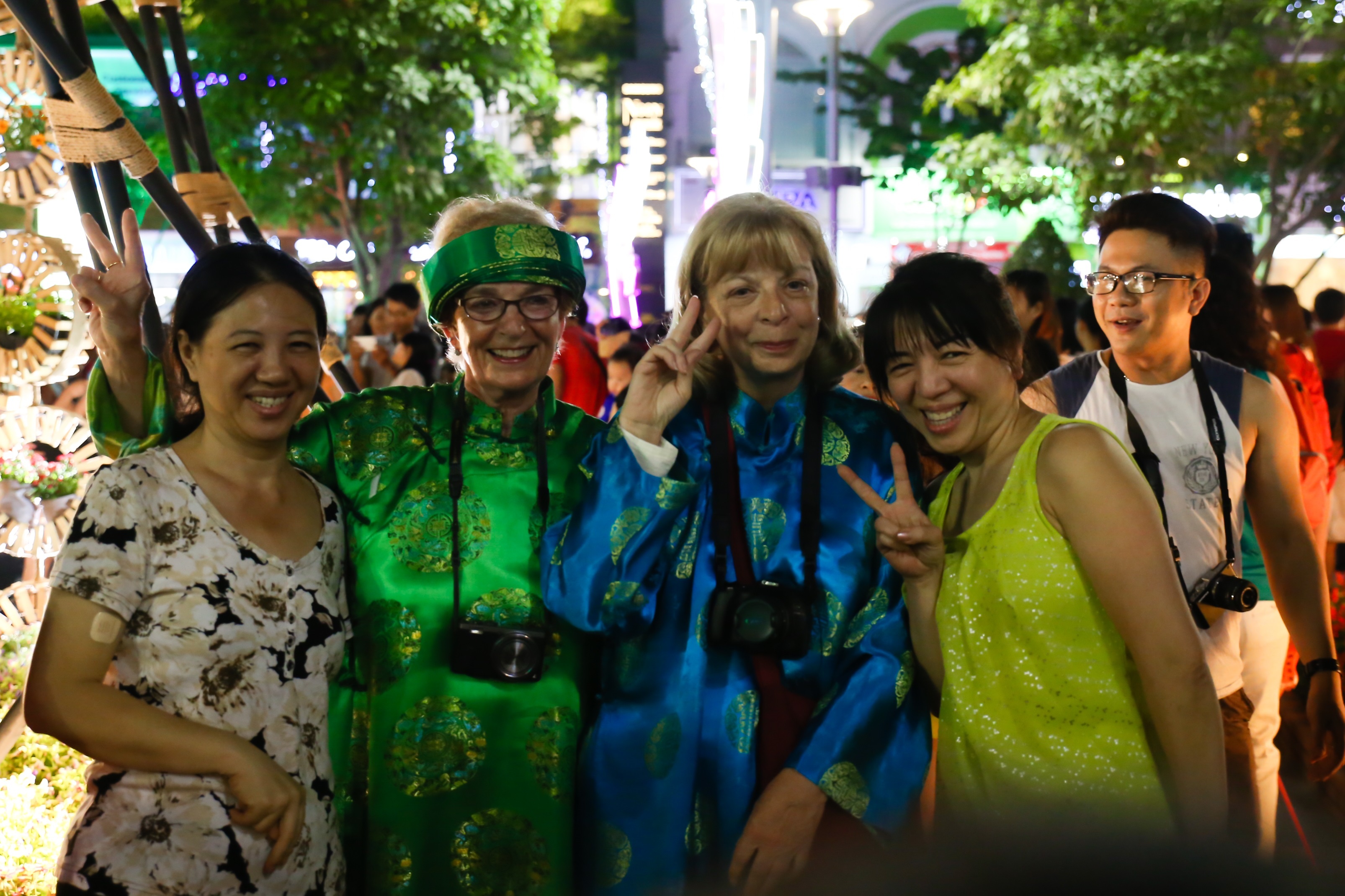 Đoàn khách du lịch cao tuổi người Mỹ hòa cùng không khí háo hức nhộn nhịp với người dân thành phố. |