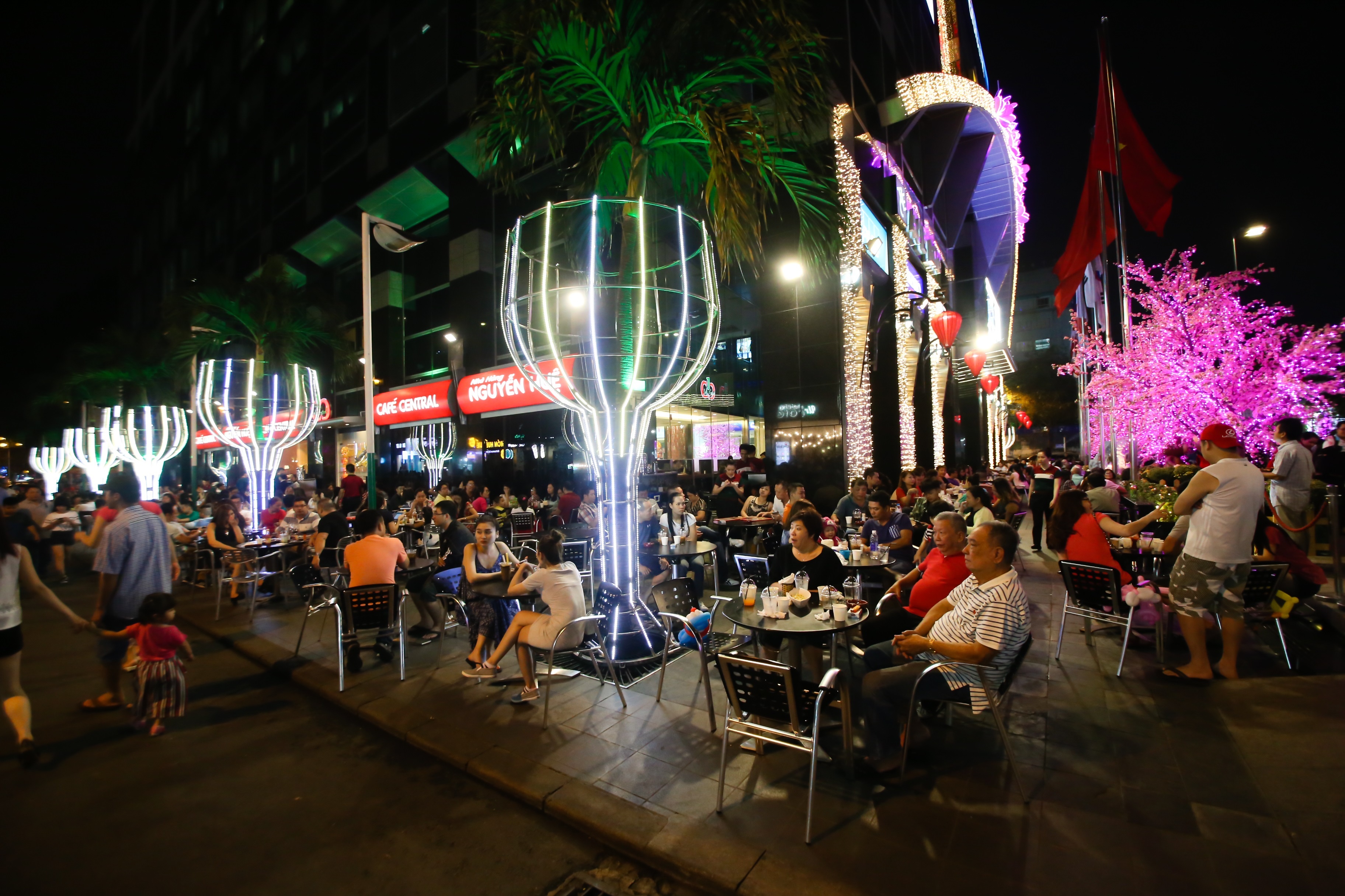 | Các cửa hàng ăn uống gần đường hoa cũng đông nghẹt khách. |