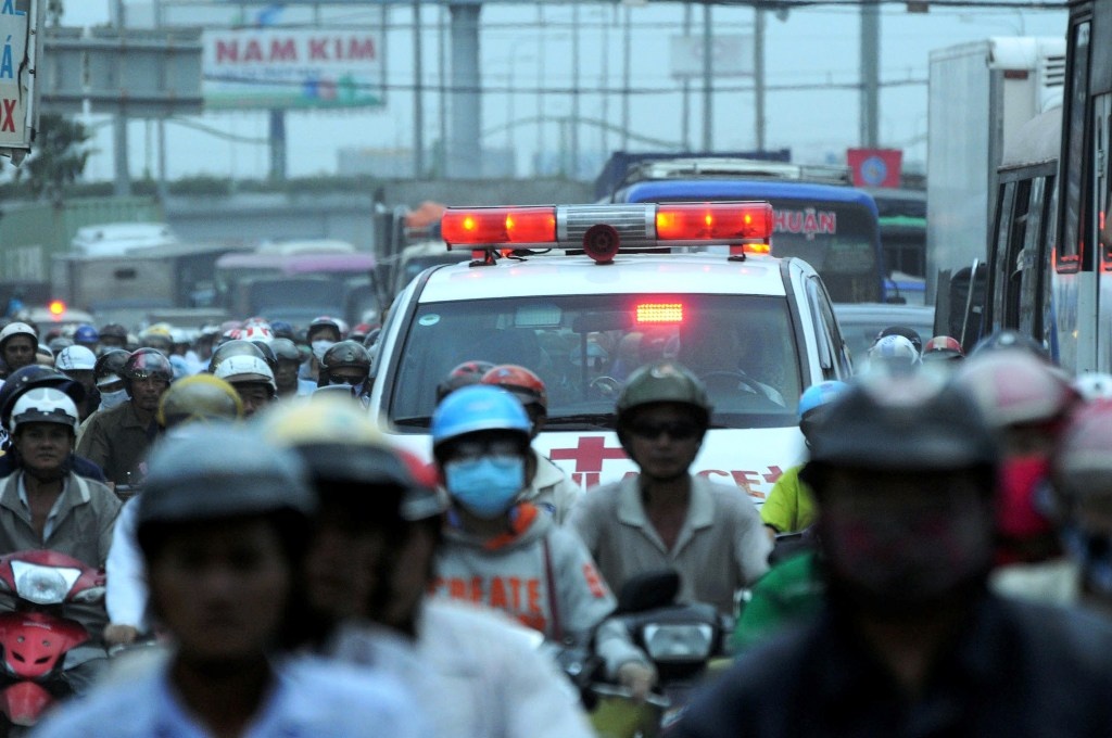 | Một xe cấp cứu "chết đứng" trong dòng người. |