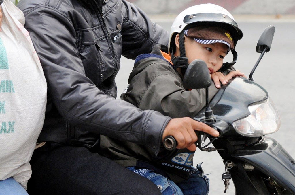 | Các gia đình di chuyển bằng xe máy về quê mệt mỏi chờ đợi vượt qua nơi ùn tắc. |