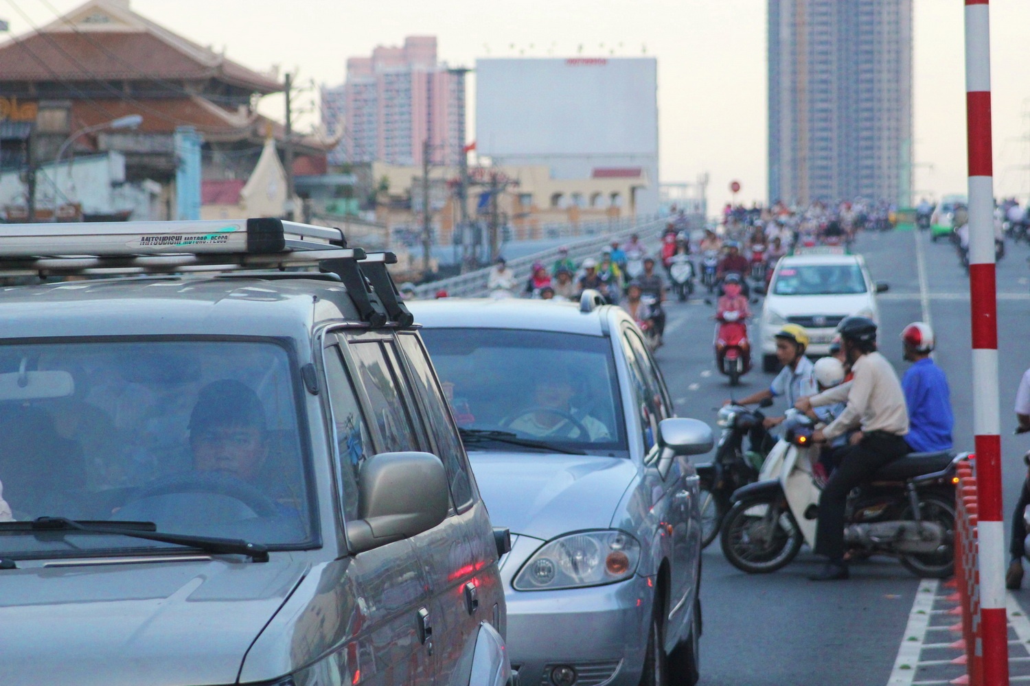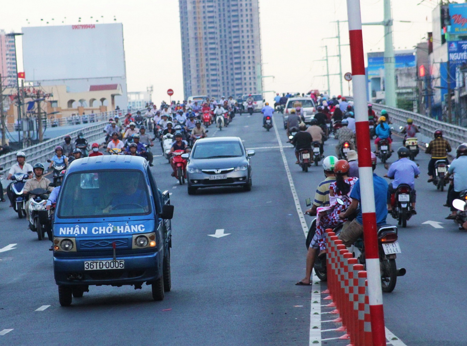 | Dòng xe đông đúc đang lao xuống dốc cầu với tốc độ cao, nhất là ô tô. |