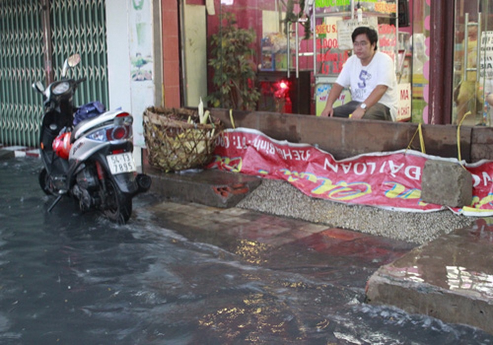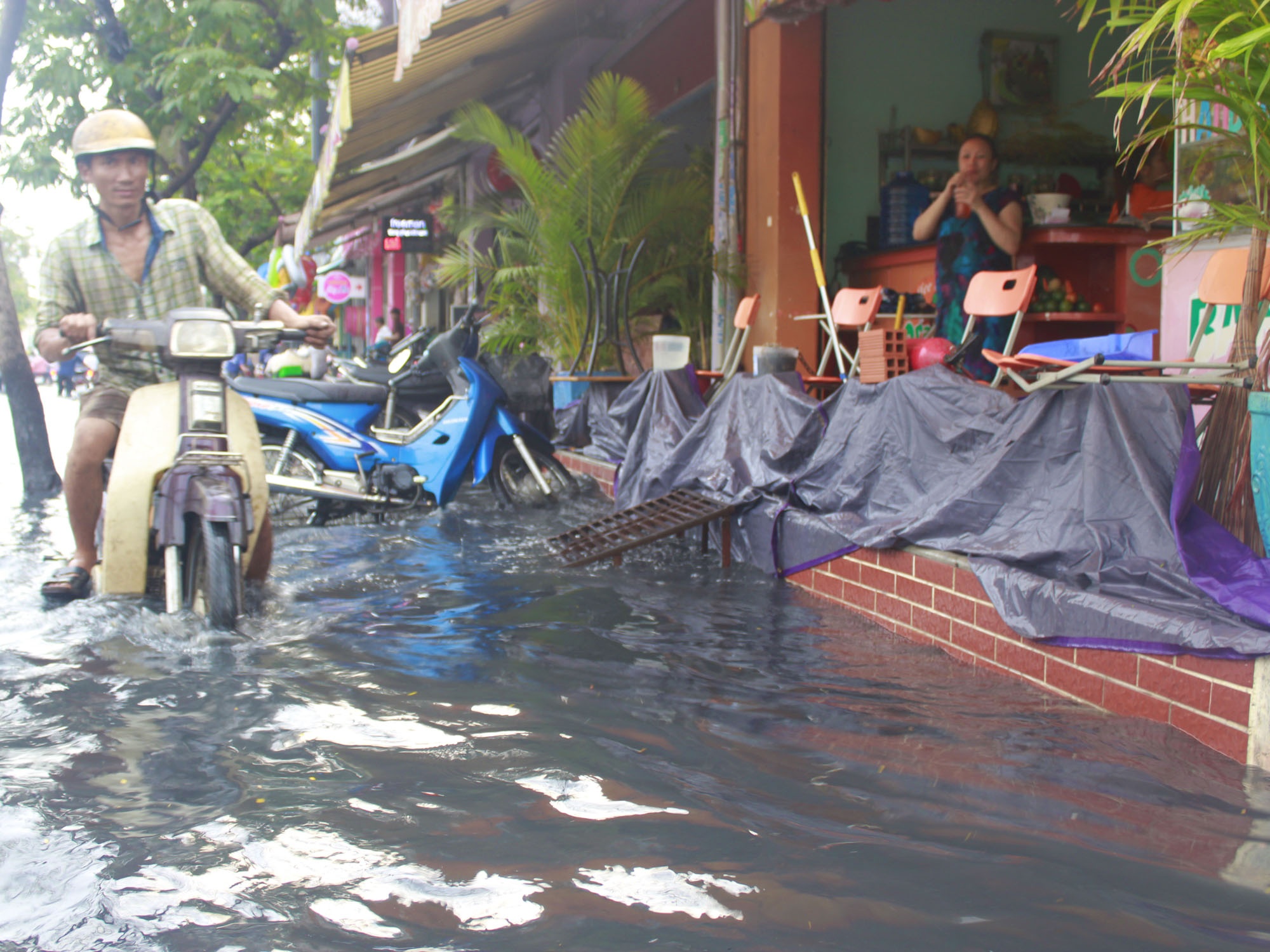 Đường bị ngập nặng, mỗi khi xe ô tô chạy qua thì tạo nên từng đợt sóng đánh nước và rác vào nhà dân.